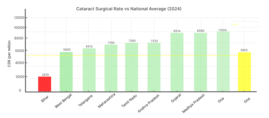 Updated 2024 Cataract Surgical Rate (CSR) data from NPCB & VI reveal that while the national average has risen to 5,855 surgeries per million population, surpassing the WHO benchmark, Bihar’s CSR lags at 2,819 per million.